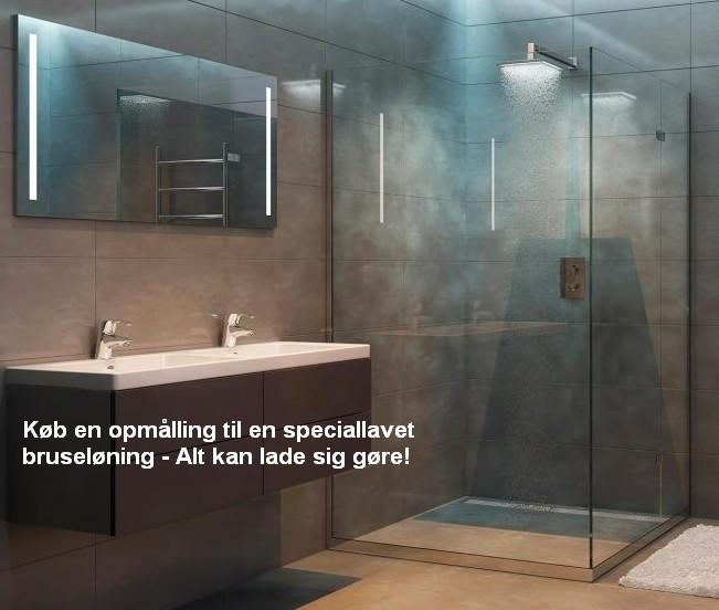 Opmåling til en speciallavet bruseløsning - Alt kan lade sig gøre Har du brug for en speciel bruseløsning, så har vi en stærk samarbejdsparter til denne opgave - En landsdækkende service, dog kun til brofaste øer.. Alt kan løses, der flere farver og glastyper, man kan lave til skrå vægge og ekstra højde end de normale 200 cm. Efter endt besøg, så kommer der en konkret pris på den konkrete løsning |