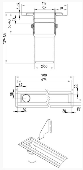 Blucher Waterline 700 mm afløbsrende Beton og fliser Gulv: beton og fliser- Ramme: rektangulær- Udløb: Ø50mm, lodret- Rustfrit stål: AISI304/EN1.4301 Smøremembran NYT: Samme model kan vendes med udløb mod venstre eller højre og installeres mod væg(ge) eller fritliggende i gulv. |