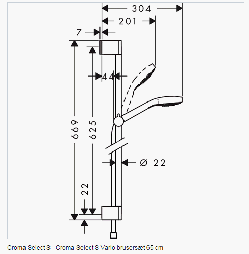 Brusersættet Croma Select S Vario 9 l/min forkæler med masser af komfort under bruseren og sparer også på vandet med den moderne håndbruser fra hansgrohe. Derved begrænses gennemstrømningsmængden automatisk til maks. 9 l/min – også ved højt vandtryk (EcoSmart). Fuld komfort med nemt skifte mellem tre stråletyper: Omstilling direkte på grebet ved at trykke på en knap (Select). Ud over håndbruseren indeholder det komplette sæt også en original Unica bruserstang og en bruserslange på 1,60 m. Glideren på bruserstangen (0,65 m) kan justeres trinløst i højden, og dens hældning kan reguleres med 45°.