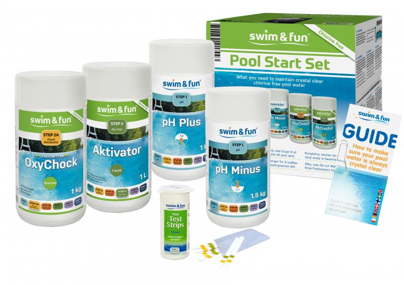 Swim & Fun Chlorine-Free Pool Start Set Klorfri startpakke til at holde badevandet rent og indbydende i havepools. Indeholder 1 kg OxyChock, 1 liter Aktivator, strips til at teste pH og Aktiv Ilt niveauet. PH Plus/Minus til at justere pH niveauet samt vandpleje guide