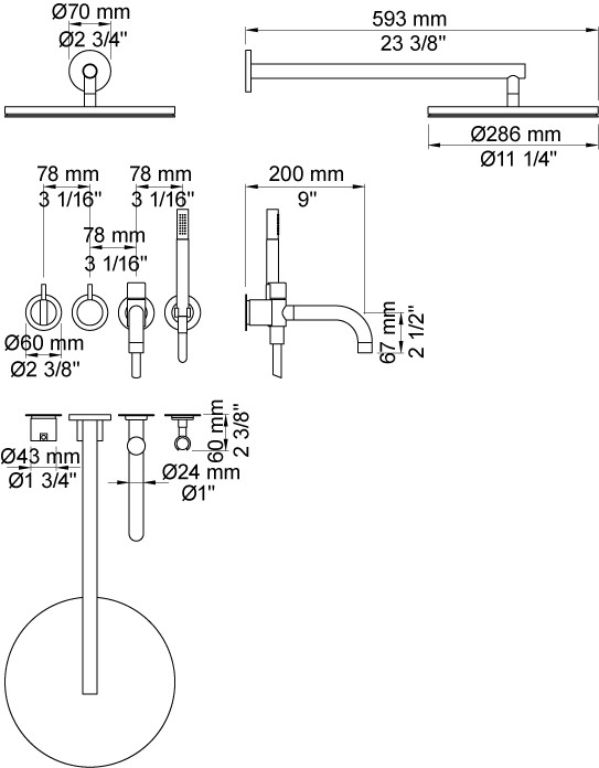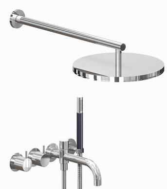 Et-grebsblander med keramisk ventilenhed 2400N, greb NR21, omskiftergreb NR24G, 200 mm kartud med omskifter 040D, vægmonteret hovedbruser 060, Krom |