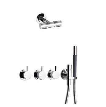 Vola 5471R-081D komplet brusesystem m/termostat - Krom Vola Indbygningstermostat ¾'' med omskifter T2 håndbruser med metalslange og holder til højre Dobbelt hovedbruser, 115 mm Separat udløb Rosetter Krom 16 3/4''RG/PEX |