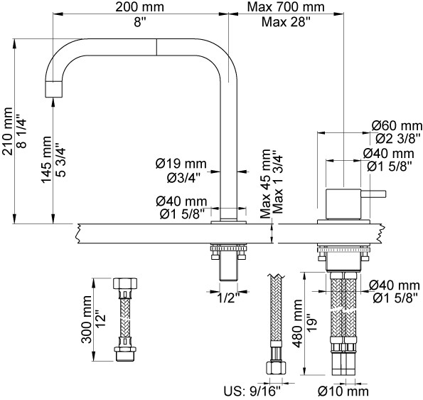 Vola køkkenbatteri model 590. Et-grebsblader med keramisk ventilenhed, for sargmontage 500, og 090 med vandbesparende luftindblander. |