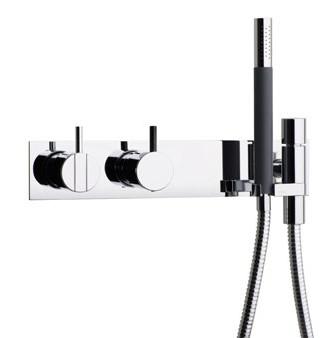 Vola Et-grebsblander for stor vandmængde med keramisk ventilenhed og omskifter samt løs afgangsmuffer. T2 Håndbruser med metalslange og holder Separat udløb Dækplade Krom 16 ½''RG/PEX |